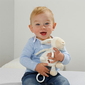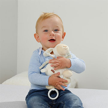 Die Spieluhr Schaf aus der Kollektion BabyLOVE wird das Herz Ihres Babys im Nu erobern. Sein freundliches Gesicht und die besonders weichen Materialien laden zum Fühlen, Knuddeln und Liebhaben ein. Einfach aufziehen, eine beliebte Melodie erklingt und Ihr Baby wird beruhigt, getröstet und sanft in den Schlaf gewogen. Das Spielwerk kann durch Öffnen des Sicherheitsreißverschlusses zum Waschen entnommen werden. Das niedliche Schaf wird mit zwei Bändern ganz einfach an Bettchen, Kinderwagen und Babyschale befestigt. Mit seinem freundlichen Gesicht und den liebevollen Details ist es zuhause und auch unterwegs ein echter Hingucker und wird schnell zum besten Freund Ihres Babys.