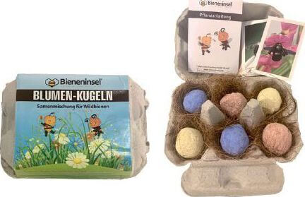 6 Samenkugeln, bestehend aus: Kokosfaser, Erde-Kompostgemisch, Tonpulver, auf Wildbienen abgestimmtes Saatgut, Pflanzanleitung, Karten zur Wildbienenbestimmung.
