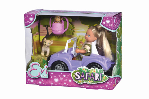 Evi im süßen Safari Outfit mit coolem Jeep, Rucksack, Baby Affe und Löwe, sowie Fernglas. L:16cm, 12cm, WB, 3J+
