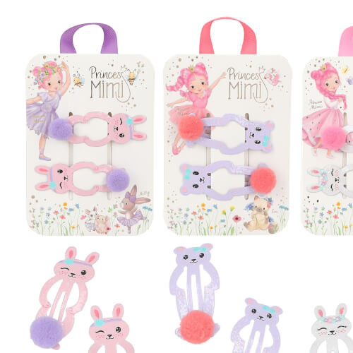 Für tierisch süße Frisuren: Die Haarspangen in Tier-Form haben an der Spitze einen flauschigen Pompon. Drei Designs: Bären in blassem Lila mit Glitzer und apricotfarbenen Pompons, Hasen in Weiß mit Glitzer und rosafarbenen Pompons, Hasen in Rosa mit Glitzer und lilafarbenen Pompons. Jeweils zwei Haarspangen auf einer Karte. Von Princess Mimi.