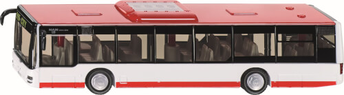 Sehr aufwändiges Bus Modell des Original Vorbildes MAN Lions City im Maßstab 1:50. Räder mit gummierten Laufflächen. 2-Achsen, wobei die zweite Achse zwillingsbereift ist. 2 Türen an der rechten Fahrzeugseite zum Öffnen. Motorklappe im Heck zum Öffnen. Getönte Scheiben. Separate Rückspiegel und eingesetzter Kühlergrill. Leuchten vorne und hinten aus Kunststoff. Dachaufbau mit Klimaanlage. Ab 3 Jahren.