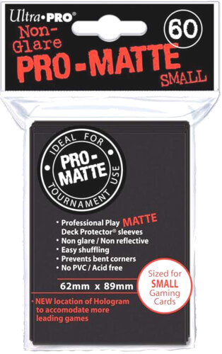 Ultra Pro Matte Sleeves in schwarz. Klein. Die berühmte PRO-Matte jetzt auch für kleine Spielkarten! Maße: 10x 8,5 x 2,3 cm.